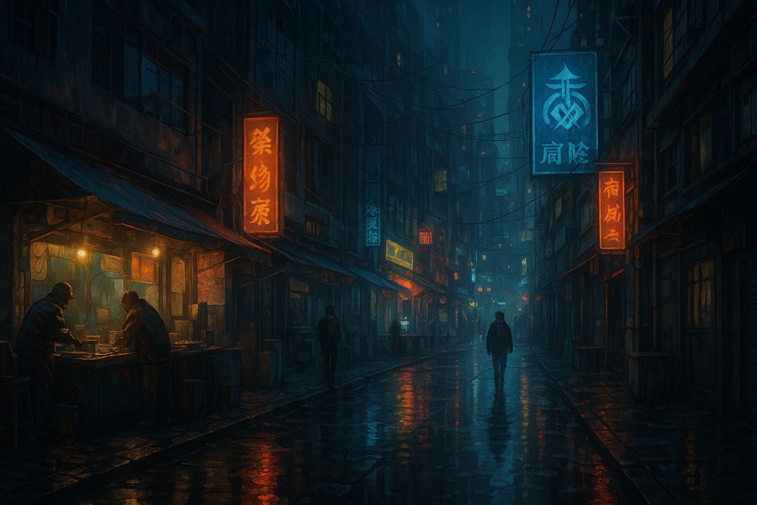 夜の龍門。濡れた路地にネオンがにじみ、屋台の呼び声が風に消えていく。