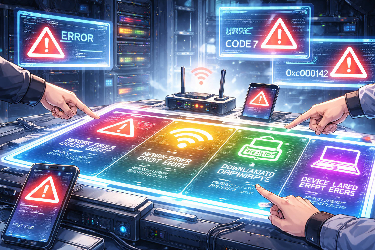 ここは「コードの暗記」ではなく、発生場面→原因候補→優先対処で一覧化します。ゲーム側の仕様更新でコードの意味が変わる可能性があるため、エラー発生の場面(起動/ログイン/更新/ロード)も必ずセットで見てください。