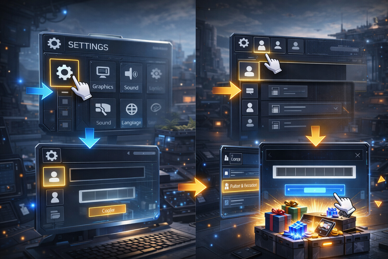 ここでは、可能な限り迷いにくい形で「コード入力(交換コード)」に到達する手順を整理します。表記や配置は環境(言語設定・バージョン・プラットフォーム)で異なる場合がありますので、文言が一致しないときはアイコン(歯車・人型)やタブ構造もあわせて確認してください。