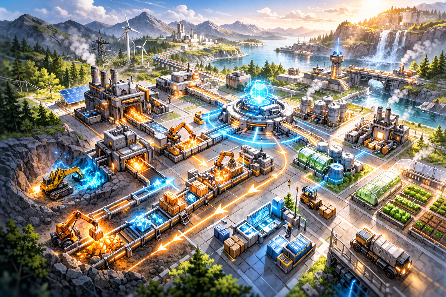 エリア拡張 → 倉庫連結ハブ → 電力基盤 → 採掘 → 製錬 → 組立 → 拠点取引(派遣最適化)