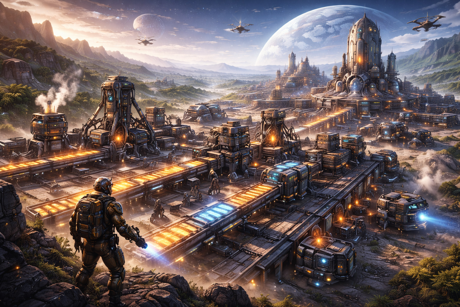 このゲームでは、広大な惑星を探索しながら資源を集め、採掘機や精製設備、ベルトコンベア、発電設備をつなげて、少しずつ巨大な工場網を作っていきます。