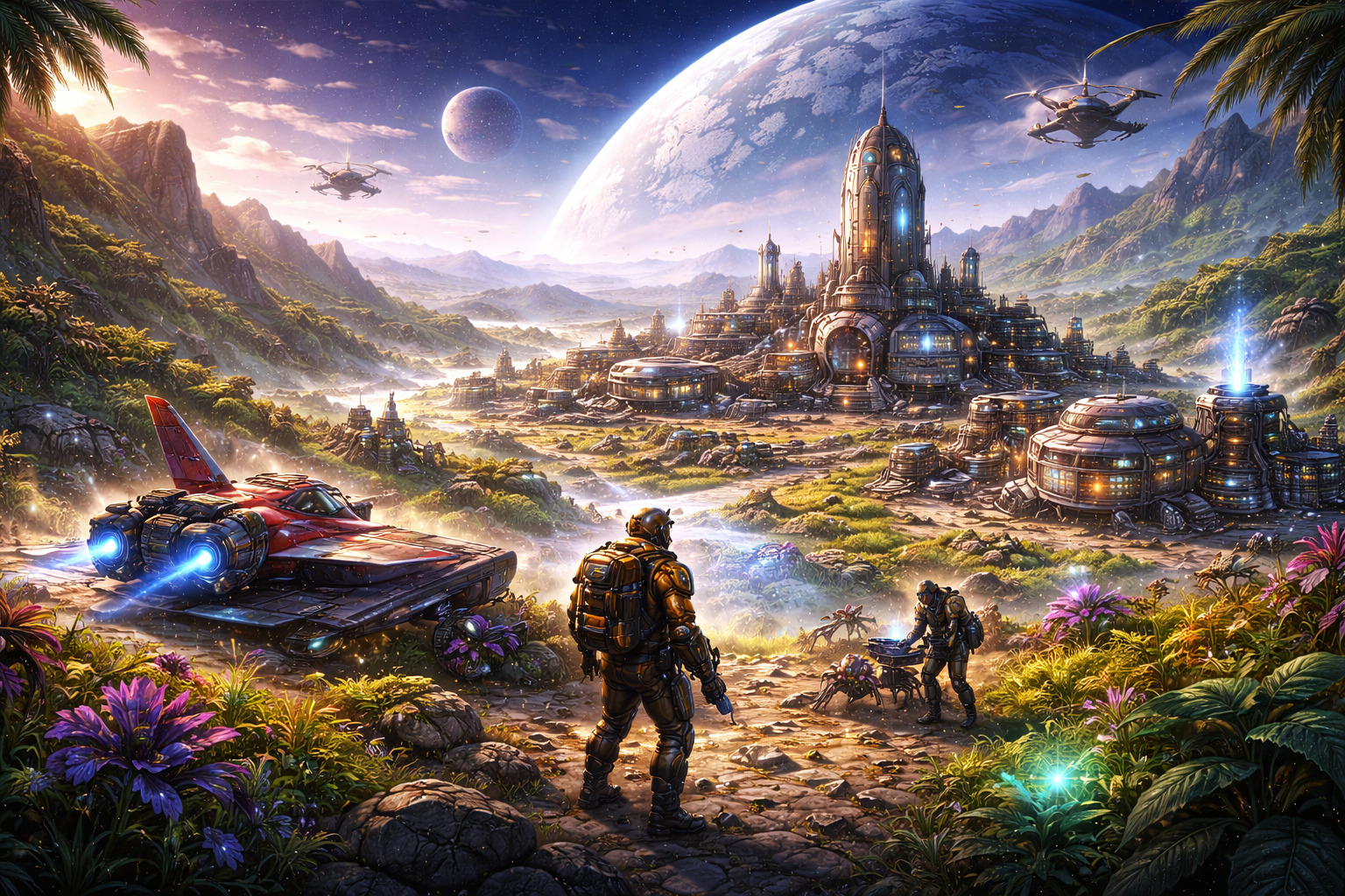 No Man’s Skyが有力です。広い宇宙を旅しながら、基地建築や集落運営も楽しめます。