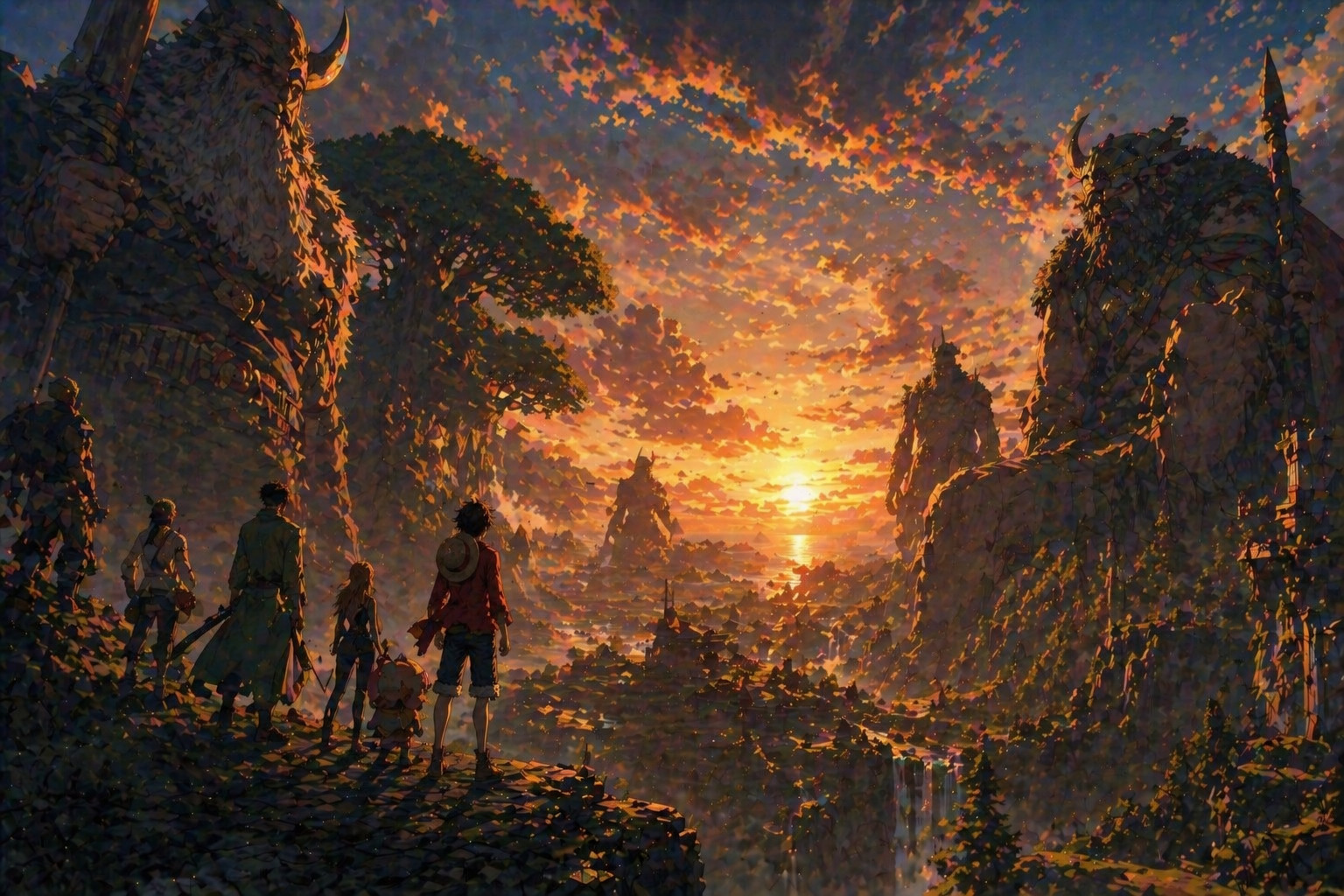 前章「エッグヘッド編」は、ネオンカラーやパステル調の色彩が踊る、非常にポップでSF的な世界観でした。しかし、このエルバフ編のOPはどうでしょうか。画面全体を支配するのは、深い森の緑、岩の灰色、そして沈むような夕陽のオレンジです。